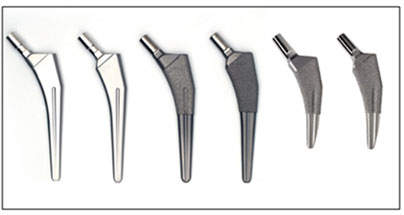 (Left) A standard cemented femoral component. (Center) A standard un-cemented femoral component (Right) A small uncemented femoral component