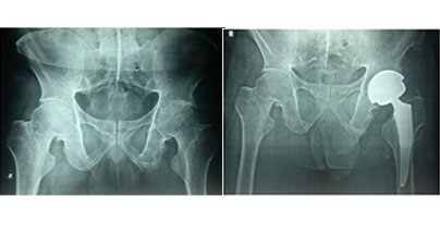 X-rays before and after total hip replacement. In this case, non-cemented components were used.