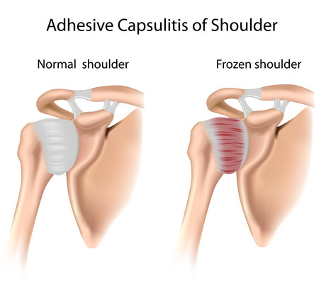 This extreme stiffness in the shoulder can occur at any age. It affects approximately 2 percent of Americans, most often between 40 to 60 years of age. Although the causes are not completely understood, it can affect people with diabetes, thyroid disease, heart disease, or Parkinson's disease. It can also occur if the shoulder has been kept immobile for a period of time. It occurs when a minor shoulder injury heals with scar tissue that affects how the joint moves. This scar tissue reduces flexibility in the shoulder and makes it more prone to injury. The major symptom is the inability to move the shoulder in any direction without pain. Treatment can be NSAIDs, cortisone injections or physical therapy. You can reduce further injury and stiffness by stretching before starting activities.